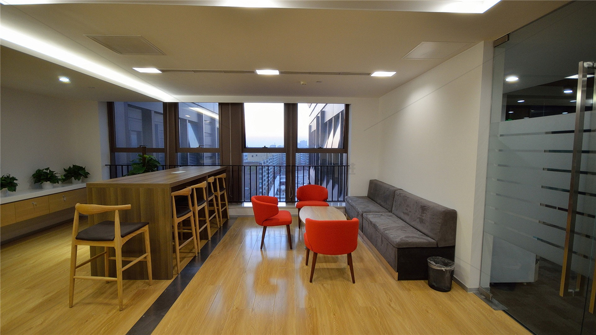 繽紛的休閑沙發&茶幾,配以原木色的吧臺。你可開啟一場有趣的聊天,或者欣賞窗外的綠色。員工也可以在這個區域里充分交流溝通,休息娛樂無限創意。