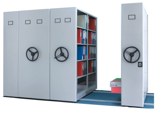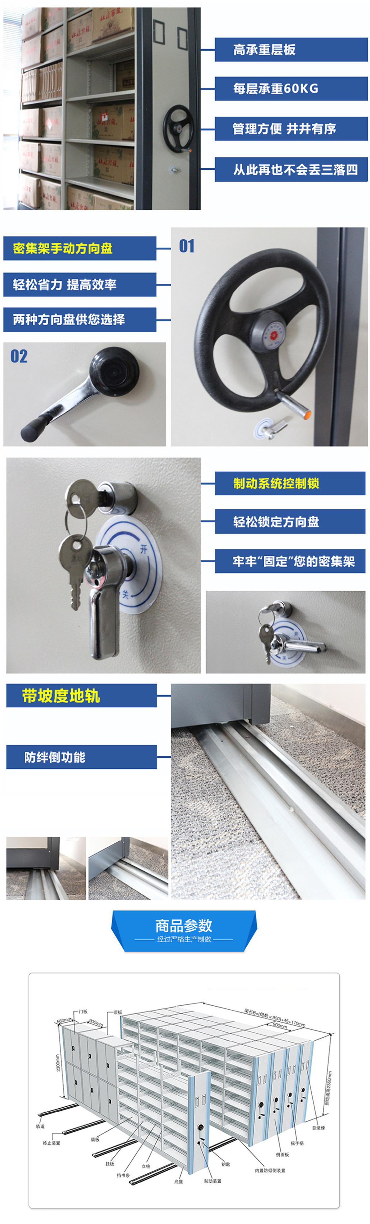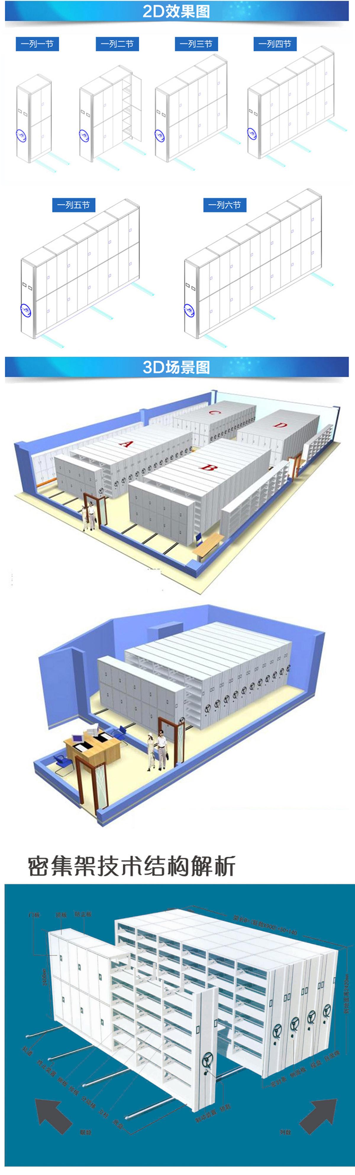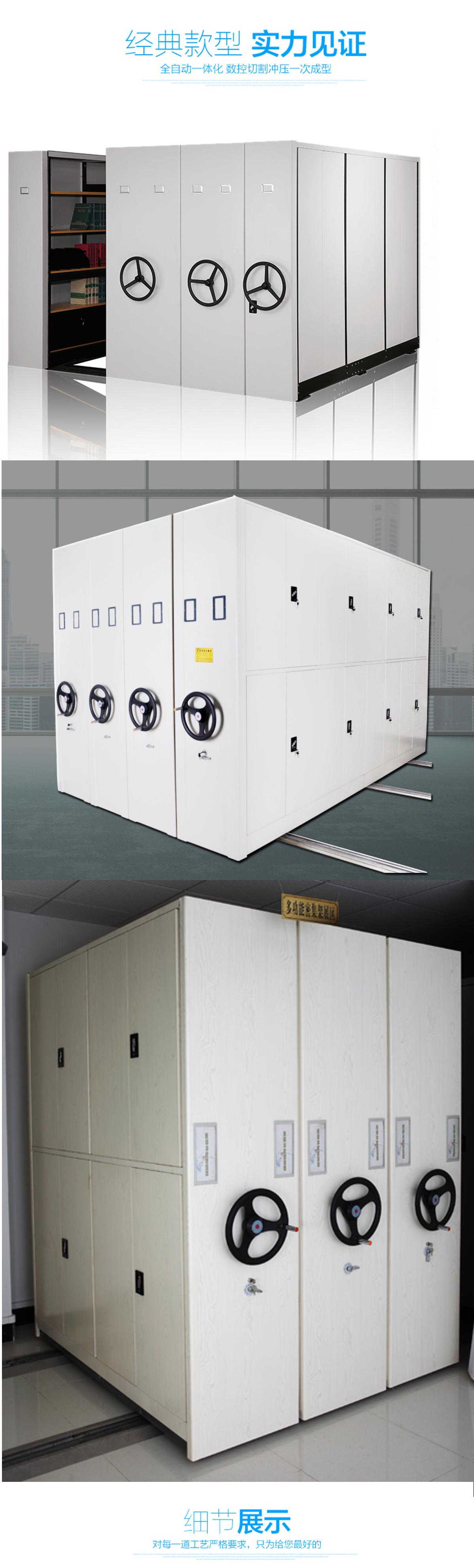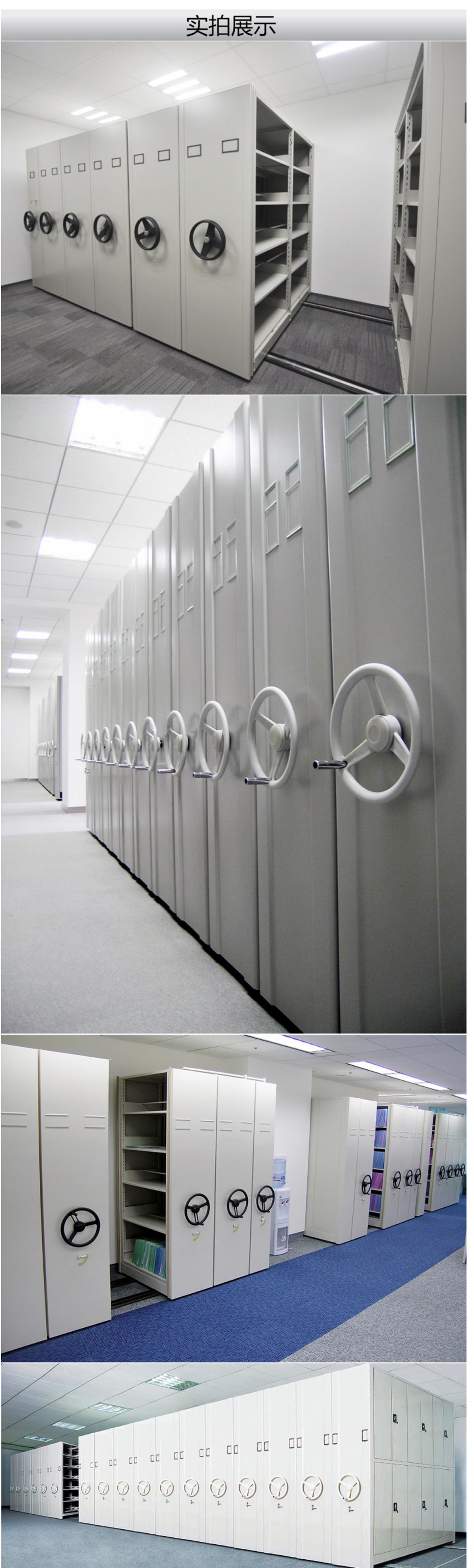 密集柜架體為箱體式結構,節與節之間有分隔板,每列中間采用6mm圓鋼,對角斜拉固定,可調整架體正斜度,搖柄采用自動脫勾式曲柄把手。移動輕便靈活。
